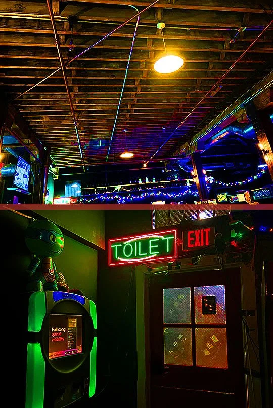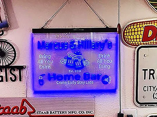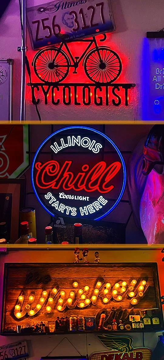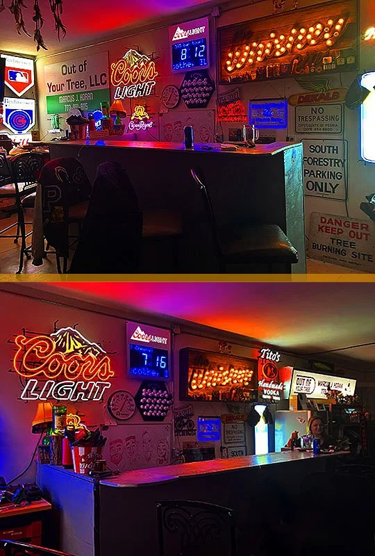 There’s some flashy and fun lit-up signage on the walls in this garage bar.