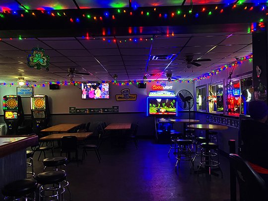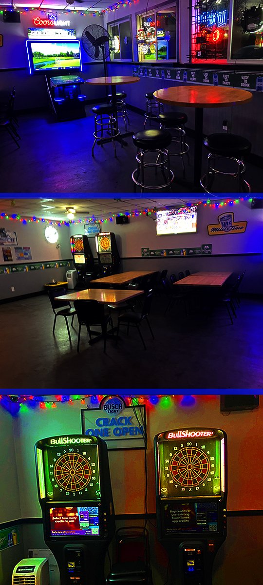 They have tables and chairs in here and two state-of-the-art dartboards in the corner over here.
