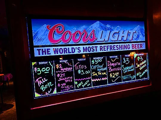 The daily drink specials are listed here on this board over on this wall behind the tables.