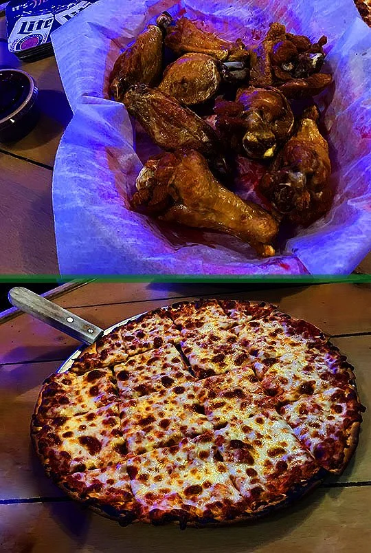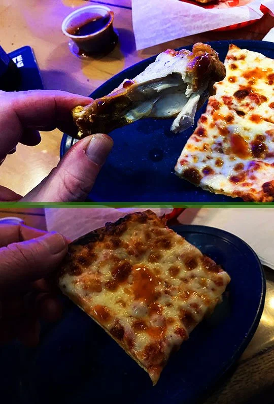 Here’s our Sunday dinner that Nancy and I are splitting. We got an order of chicken wings and a lovely cheese pizza and the food looks delicious! Time to dig in!