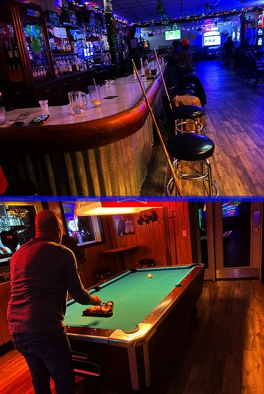 Here we are at tonight’s destination, The Bellevue Tap. I love all the lights on the outside of the bar and Jim/Vern looks absolutely electric leading the way inside!