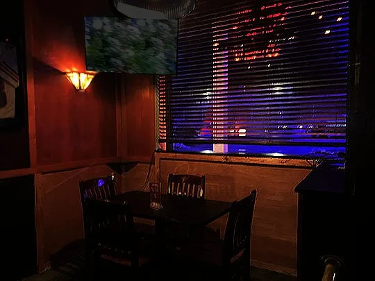 Here’s the corner table over here with a window that overlooks the parking lot outside.