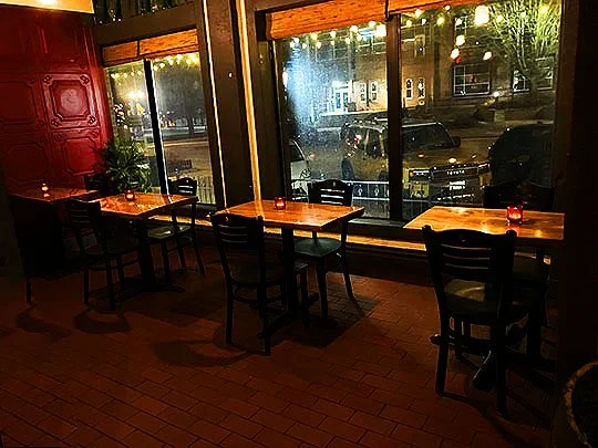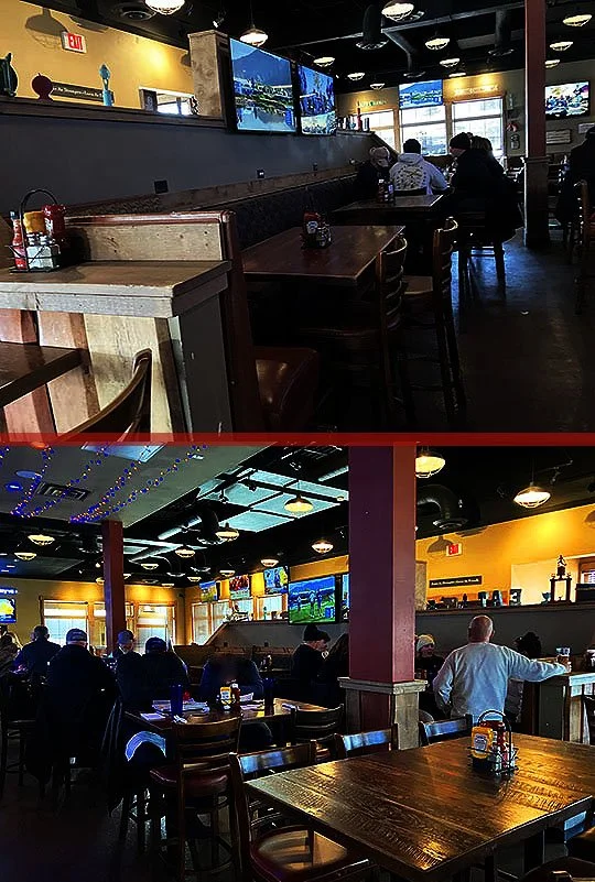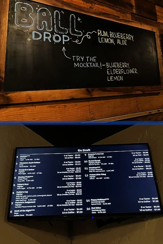There’s tables over here in this corner and there’s the main dining room along with a lit-up sign featuring the beers on tap and featured cocktails and beers of the evening.