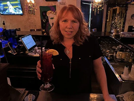 There’s the pretty bartender, Jules serving up our first signature drink of the evening, the Pat O’Briens Hurricane! Cheers!