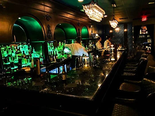 The bar in here is so nice! I love the wooden arches and the green lit-up bottles behind it.