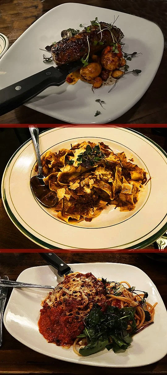 Amber got the Strip Calabrese, which is a grilled sirloin steak served with caramelized onions, roasted peppers and blistered potatoes, Joe got the Pappardelle Ragout, which is fresh egg noodles served with short rib and pork ragout, sauteed shallots and wild mushrooms and I chose the Parmigania Segreto Chicken which is a breaded chicken cutlet that is pan-fried and served with melted mozzarella, a red wine balsamic marinara and fresh bucatini pasta.