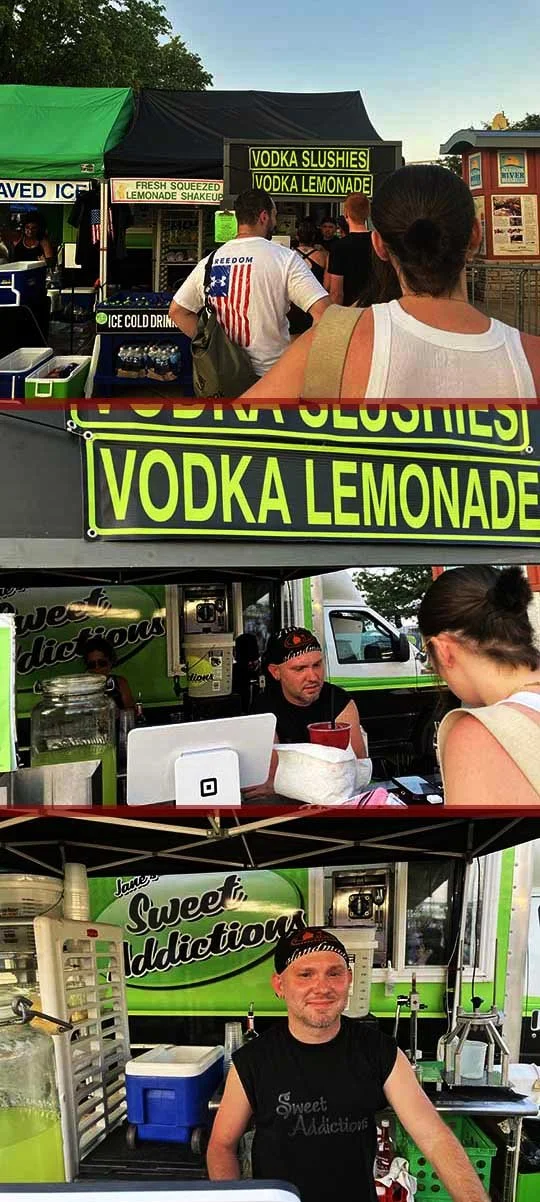 I got in line at the Jane’s Sweet Addiction stand where they’re serving up cold vodka and lemonade drinks. It took awhile in line, but we finally made it and the gentleman not only mixed me up a giganzo glass of vodka and lemonade, he also posed for a photo! Nice!