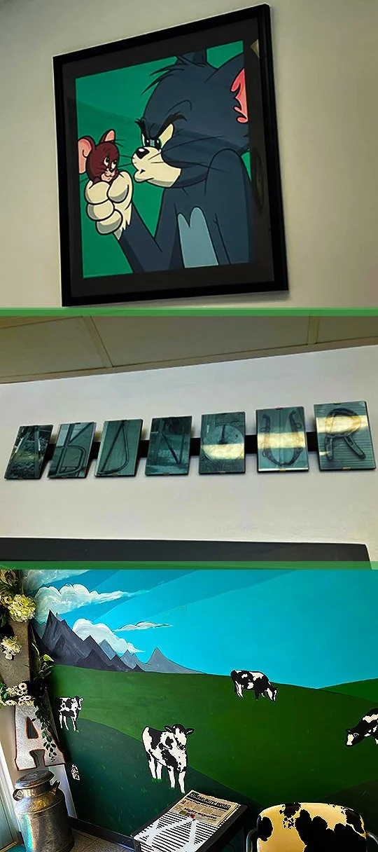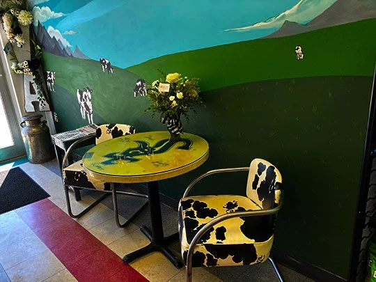 Here’s some of the art on the walls at Frank’s and the cow mural on the wall was painted by local artist, Izzy Turner.