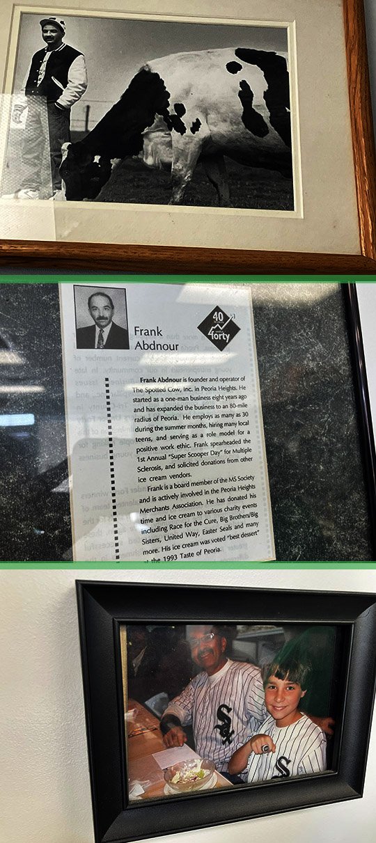 Here’s some photos on the wall including Frank with a cow, Frank featured in a 40 Leaders Under 40 group and there’s Frank with his new business partner, his son Noah at a White Sox game.