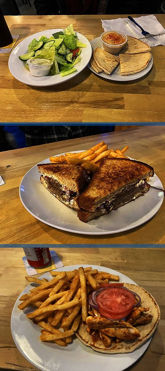From the top: Amber got a House Salad and a Hummus Plate, Joe got the Gyro Melt and I got the Buffalo Chicken Gyro.