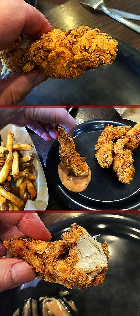 These are large chicken fingers and the breading is crispy and seasoned to perfection.The chicken is so tasty and juicy inside and these are delightful chicken fingers and the Tyler sauce compliments them perfectly!