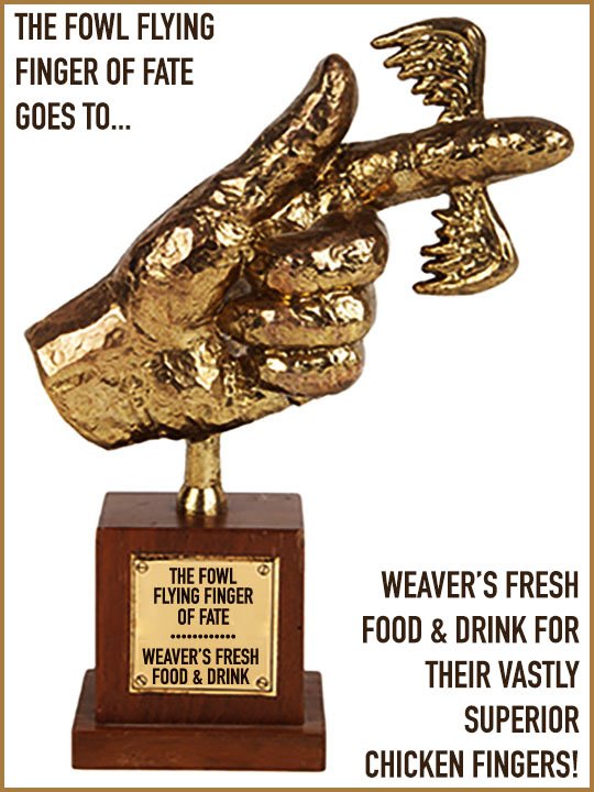 Chad Wallace suggested we give the winner the old Laugh-In Flying Fickle Finger of Fate award, but we’re giving Weaver’s Fresh Food & Drink this Fowl Flying Finger Of Fate Award for what we believe are Peoria’s best chicken fingers!