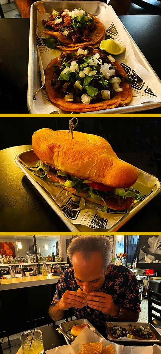 Jim got the Steak Torta Sandwich and an Al Pastor and a Bistec taco.