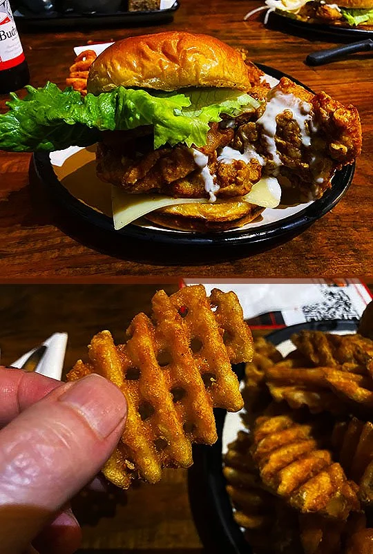 My Maple Bacon Swiss Chicken Sandwich was huge, so I thought I’d ease into it and start with one of the waffle fries.