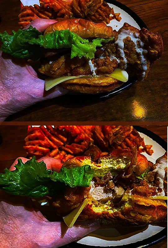 This was a giant chicken thigh, breaded and cooked to perfection and it was topped with maple aioli, a creamy and rich Swiss cheese sauce, strips of smoky bacon and served on a bakery fresh brioche bun.