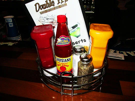 The condiment ring has been placed at my seat. And the hot sauce for the evening is Louisana Hot Sauce, that makes two weeks that we’ve been free from the generic, Frank’s Hot Sauce. Hooray!