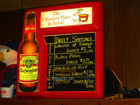A Budweiser trolley hangs over the bar, always the sign of a classic Peoria bar.