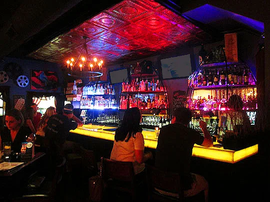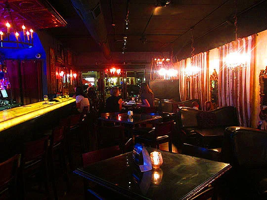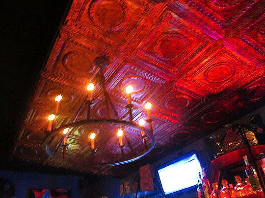 Above the bar an electric candelabra hangs beneath an elegant tin ceiling.