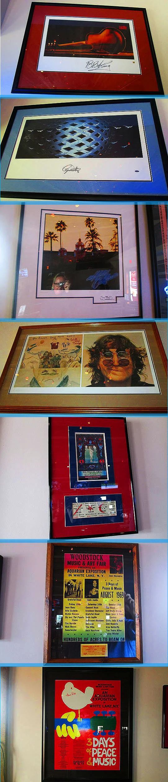 I love all the rock ‘n roll memorabilia in here and a lot of it is autographed. Up top is a B.B. King signed picture of his guitar, “Lucille,” below that is The Who’s Tommy album cover autographed by Roger Daltry, The Hotel California album cover is signed by Joe Walsh and the John Lennon, Walls and Bridges cover is signed by Yoko Ono because John Lennon’s still dead and has trouble autographing things these days. The last three are from the Woodstock festival, the first is the original handbill and ticket and below that is the second poster they printed up and below that is the final classic Woodstock poster that was used for the festival. I love all these musical memories and speaking of musical...