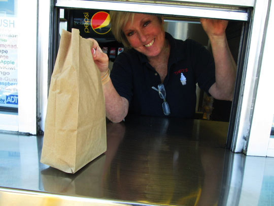 Last Monday summer officially started and so yesterday it seemed only natural to go take the annual summer pictures of Plaza Tire’s Vanna Whitewall who recently put on her bikini for the summer season. Then I thought we’d go get a summertime treat at Theo’s Ice Cream stand off of Sterling Avenue, an ice cream retreat I’ve been meaning to try out for a while now and since it’s summer, what better time than right now? So let’s make like Cheech and Chong in the ‘70’s and roll!