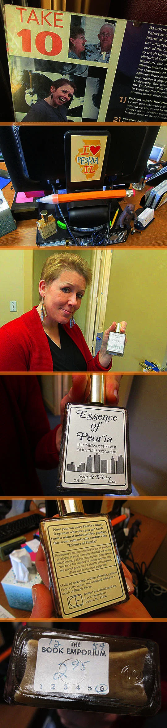 There’s a page from a Peoria Arts & Society feature on Stacy and it’s also got a picture of her parents up on top of the page! Stacy says in the article that they’ve had the greatest impact on her life. I’ve met her mom, Frank and she’s really a wonderful person...oh, okay, her mom's name isn't really Frank, it’s Franklin, but don’t tell anyone, it’s a secret! Stacy also has a Chelsie Tamms Peoria sticker and underneath that is something really special, a bottle of “Essence of Peoria!” Wow, that’s a real artifact from the ‘80’s and check out the Book Emporium price tag on the bottom, a nice chunk of Peoria’s history!