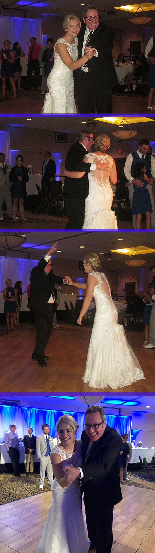 Lauren and Drew went to the dance floor for their wedding dance and then Lauren danced with her dad and after that Drew and his mom took their turn on the dance floor.