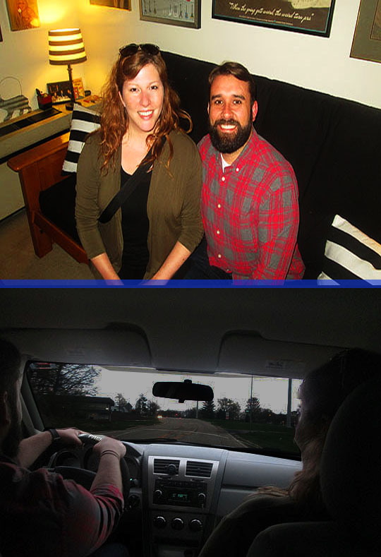 There they are seated in the MBIP World Headquarters, it’s my friends and frequent guests on the blog, Amber and Joe! They’re both looking fabulous tonight and before you know it, we’re in their car and headed towards Johnny’s in East Peoria!