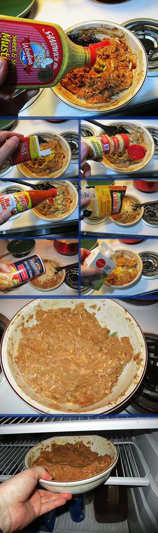 Now we’ll add some Sandwich Pal Sweet and Spicy Mustard, a nice dash of black pepper, ground mustard, some Texas Pete Hot Sauce, another shake of the shredded cheese, some bread crumbs and finally about half of the carton of liquid eggs.