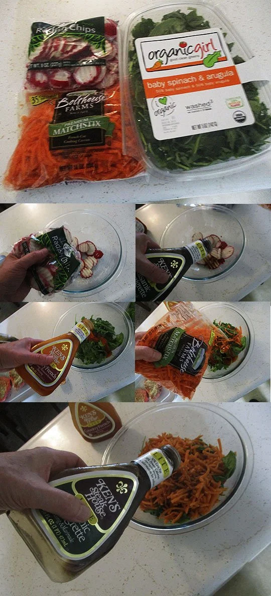 I’ve got radish chips, sliced carrots and fresh lettuce for today’s salad. Plus I’m mixing it up with Ken’s Country French Dressing and Balsamic Vinaigrette.