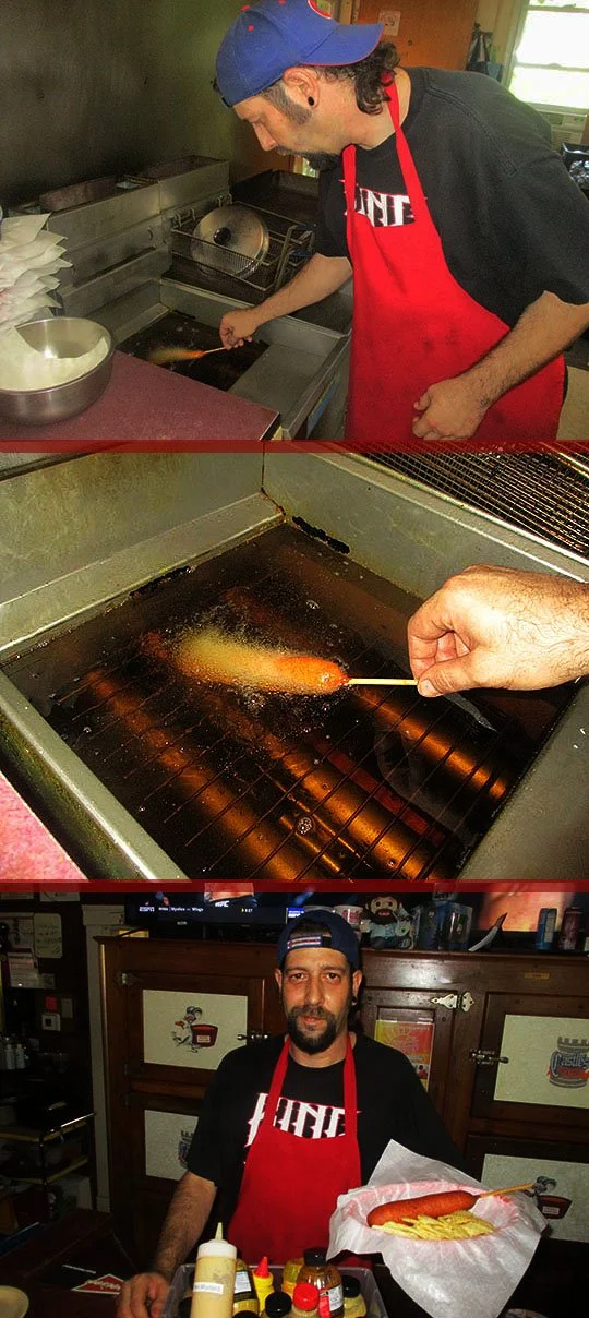 Now it’s on to the main course, the Corn Dog Basket! There’s Kevin deep-frying it up back in the kitchen and there he is serving it up at the bar.