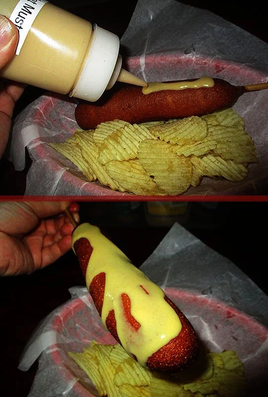 Wow, this is one delicious corn dog and that mustard takes it over the top! It’s got a nice flavor. with just the right amount of heat and the corn dog was crispy on the outside, soft inside with a tasty and juicy all-beef hot dog.