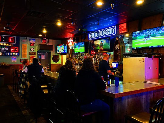 Wow, it’s big in here and that’s an impressive wooden bar. Let’s go snag a seat and get a drink.