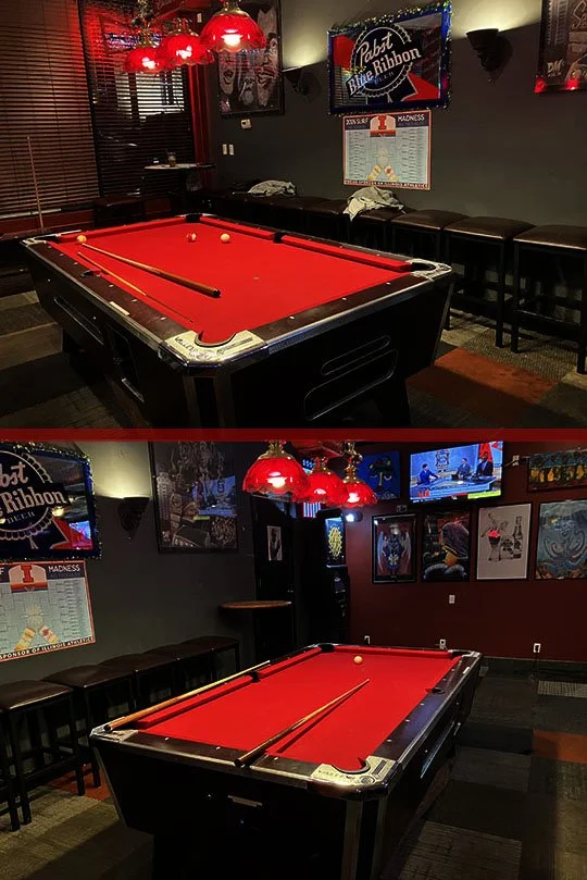 There’s a nice room featuring a pool table, a dartboard and lots of artwork over here to the side.
