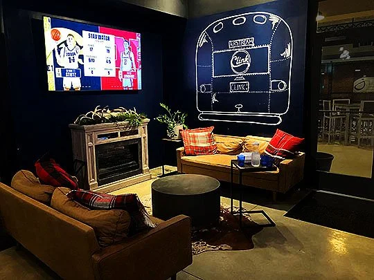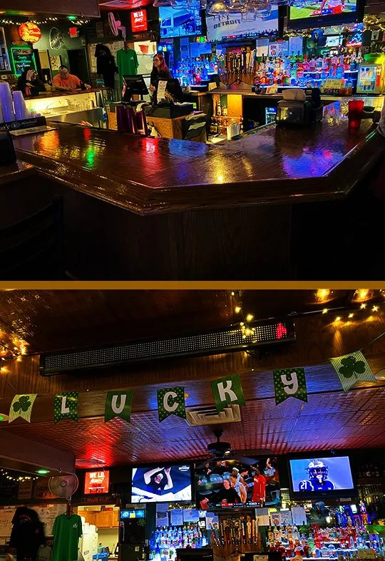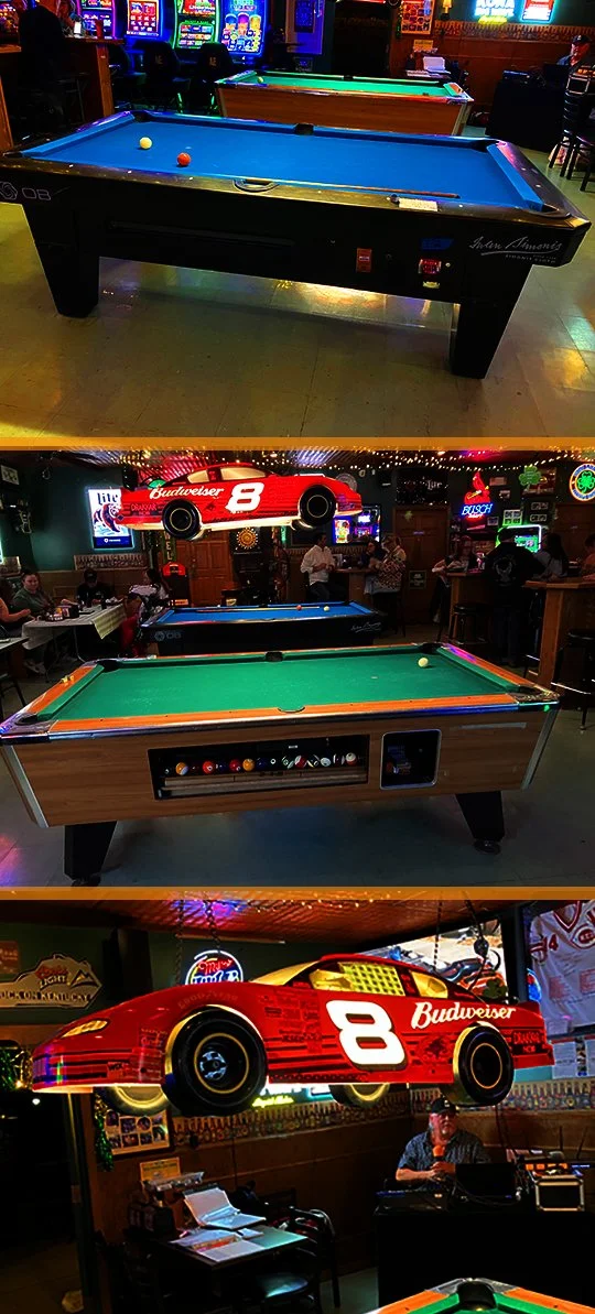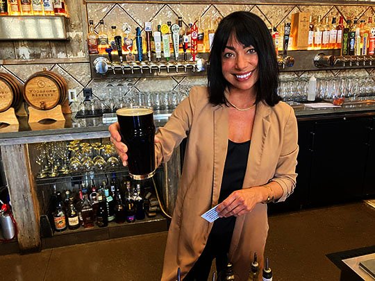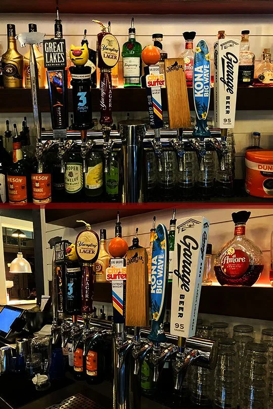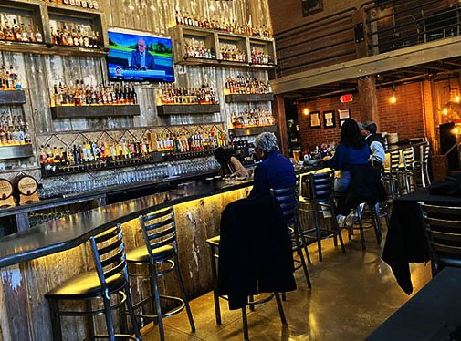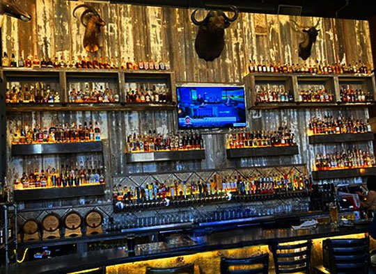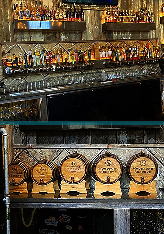 There’s the massive row of beers on tap and some wooden kegs of Woodford Reserve behind the bar.