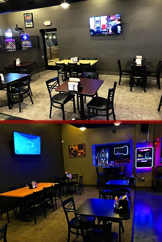 There’s a nice dining area with tables and chairs directly behind the bar.