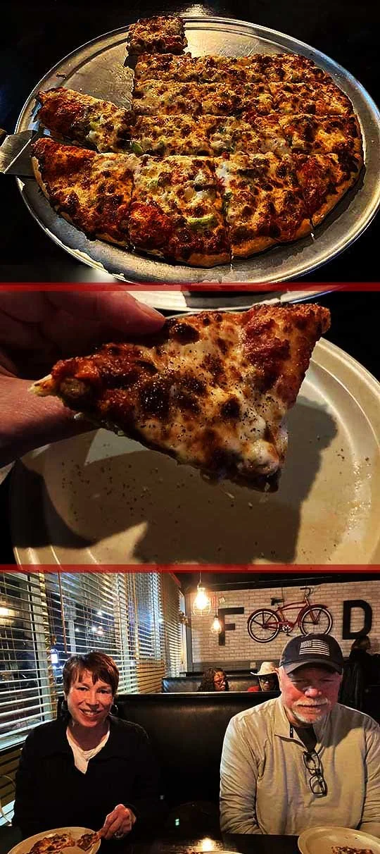 We got a Tavern Style with cheese, sausage and peppers and it was delicious! They have wonderful homemade pizza here and you should try it out. There’s Tori and Dick enjoying the pizza.