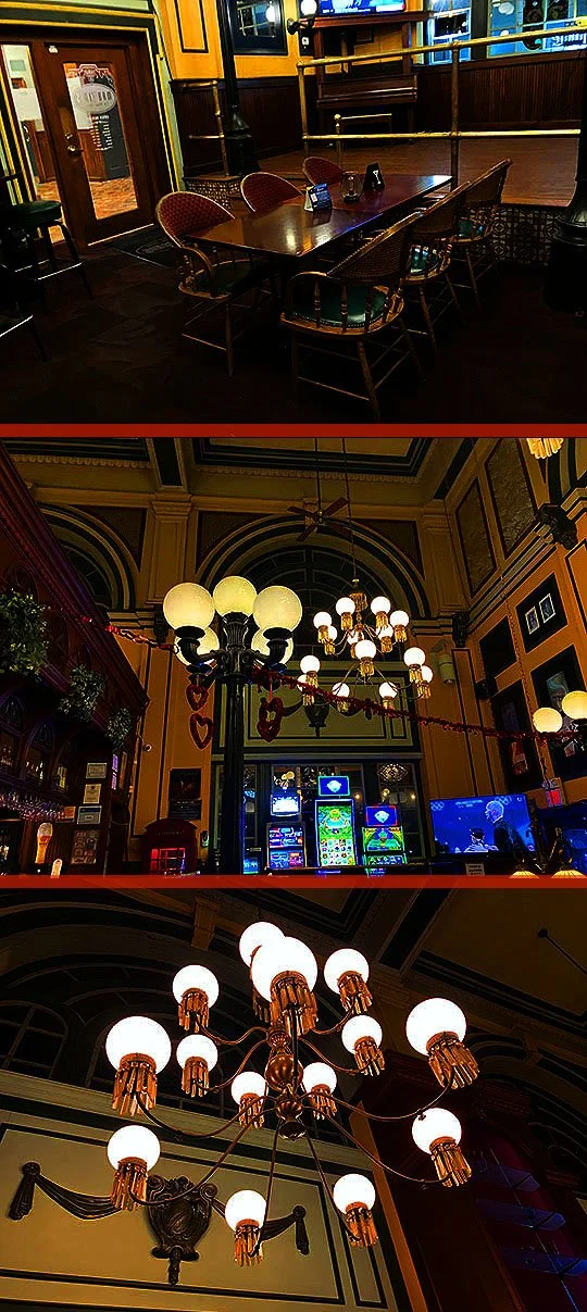 The stage for live music is behind that communal table and I love the elegant light fixtures hanging from the high ceiling in here.