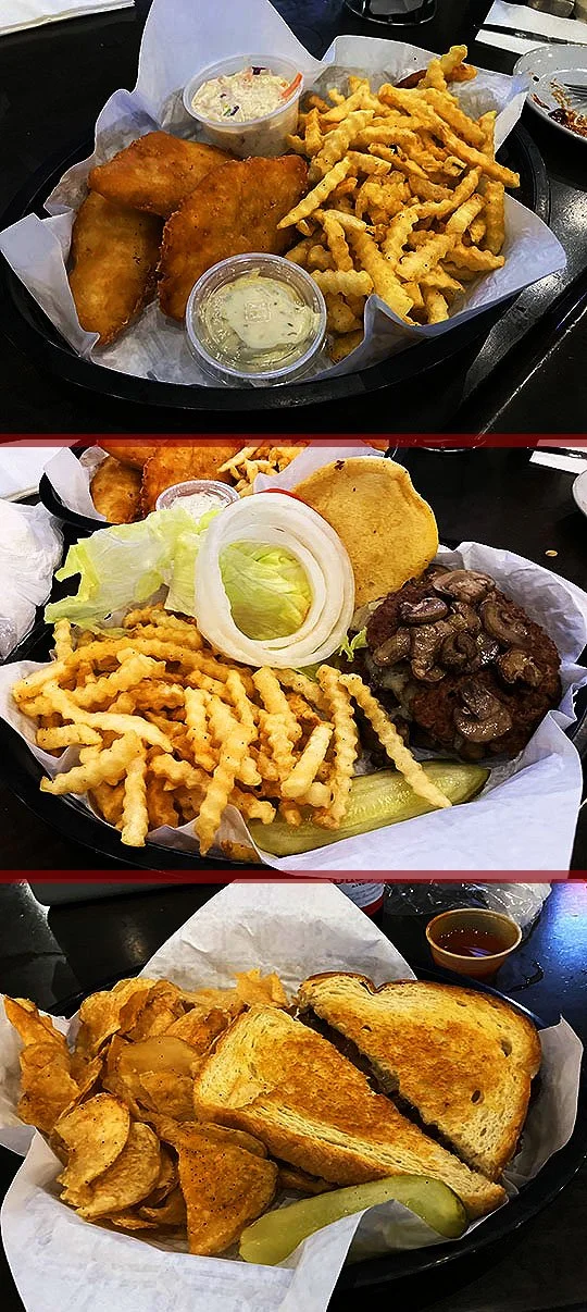 Here’s our main courses for our Saturday night dinners, Amber got the Fish and Chips, Joe got a Mushroom and Swiss Burger with fries and I got the Frisco Melt with potato chips.