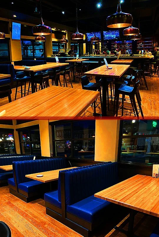 There’s a dining room to the left of the bar and large booths line the far walls.