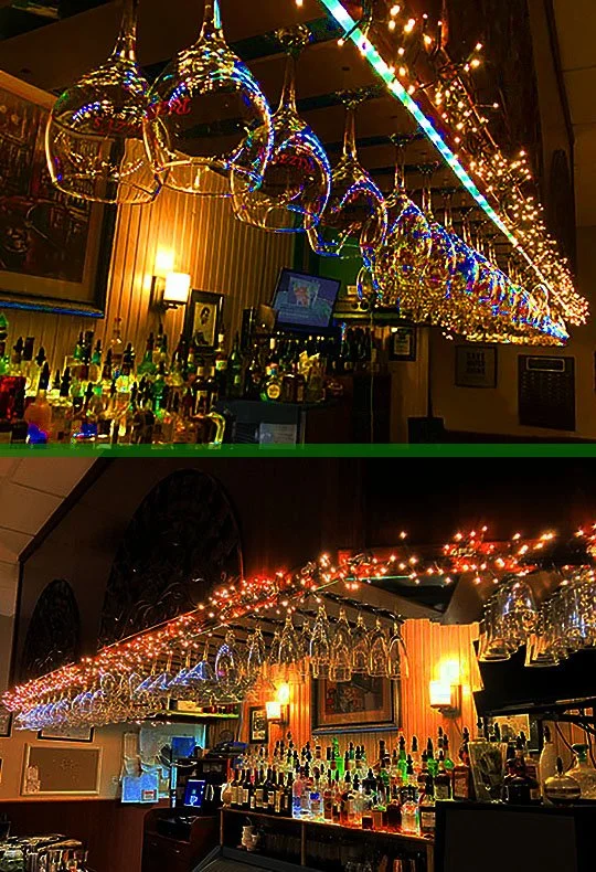 The wine glasses hanging over the bar add a nice sparkle to the bar!