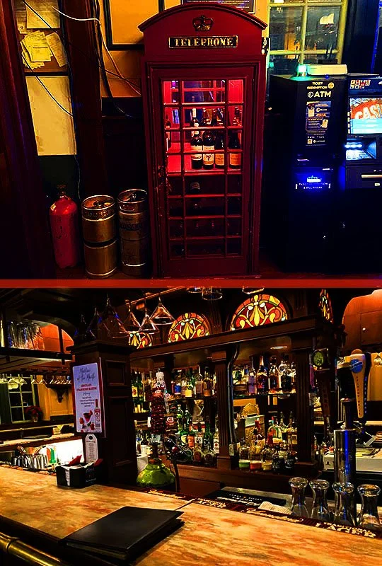Check out the telephone booth housing some bottles of vino and back at the bar…