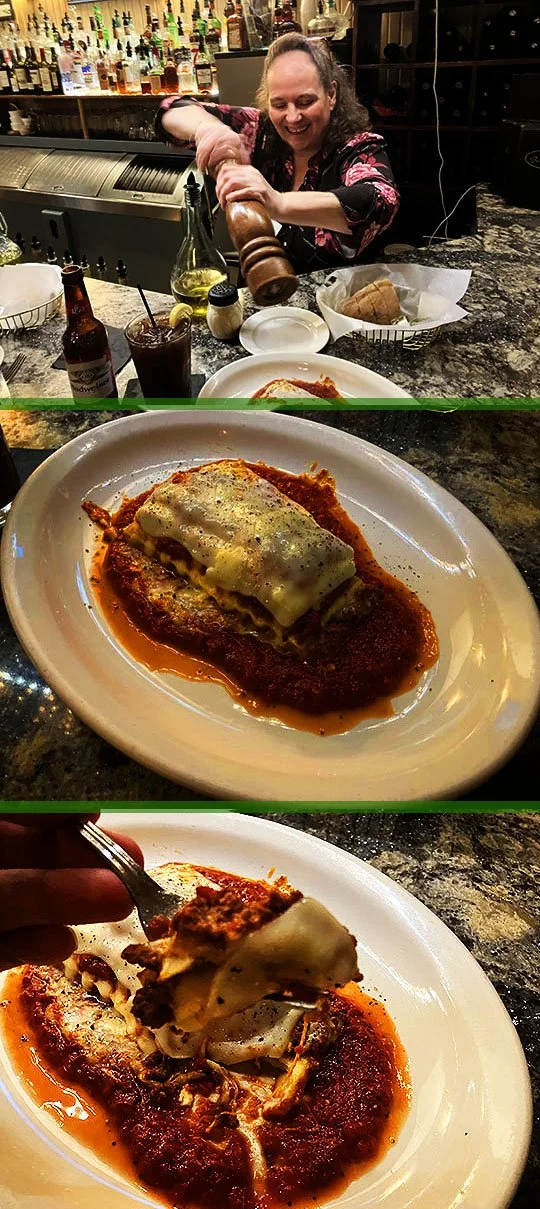 For some reason, I’ve never had the homemade Lasagna at Rizzi’s, so tonight that’s what I ordered. Once again it’s peppered up by Lisa and it looks absolutely fantastic!