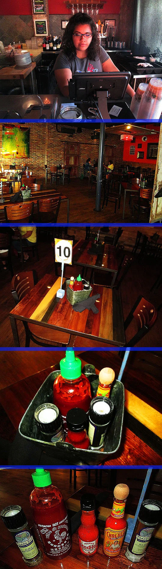 I ordered my dinner and then went to the dining room to choose my table. Since I’m dining alone tonight, I chose a small table in the middle and plopped down. I love the condiment bucket on the table and they have three different hot sauces in there. Very impressive!