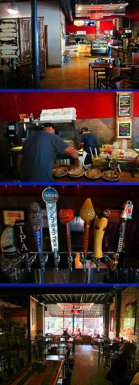 Here’s the view from my table and I wandered back up front and got a photo of the guys back in the kitchen area making some pizzas. Over to the left of the kitchen/prep area are the eight beers on tap. Meanwhile, back at my table...
