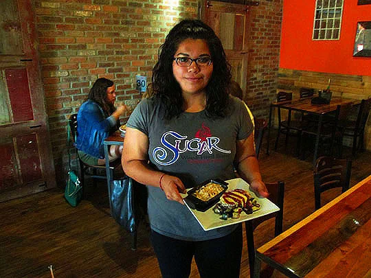 There’s lots of outside seating in front, but it’s too bright out here for me, so let’s go inside. And as we head in the front door I see two pretty faces behind the cash register and one of them is familiar! That’s Karla, on the right, who we know from visits to Salt in the Heights and Alejandra is on the left. Great to see both of them!