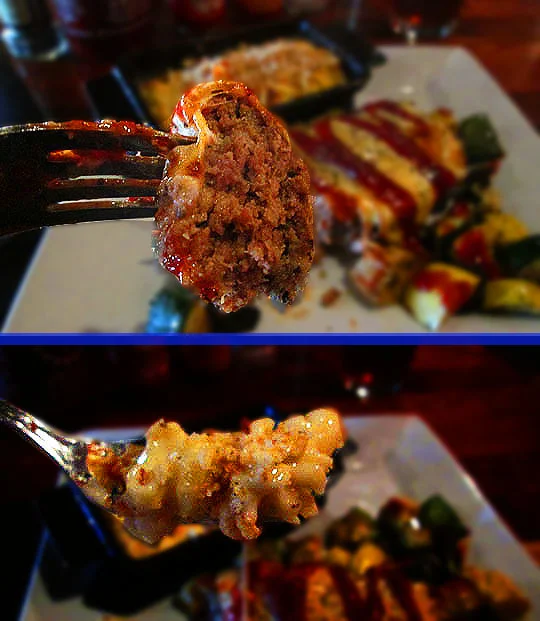I’ve always gotten pizza here and wanted to try something different, so I got the meatloaf entree, which comes with roasted vegetables and a side portion of mac ‘n cheese. It looks and smells fantastic! I think we should just go ahead and dig in!