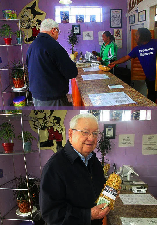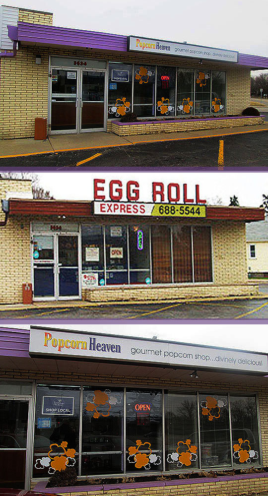 There’s the place, Young’s Popcorn Heaven. If the building looks familiar, it’s because it used to be Egg Roll Express. But get your head out of the past, that was yesterday and today it’s Young’s Popcorn Heaven! So let’s move together in a forward-like motion.