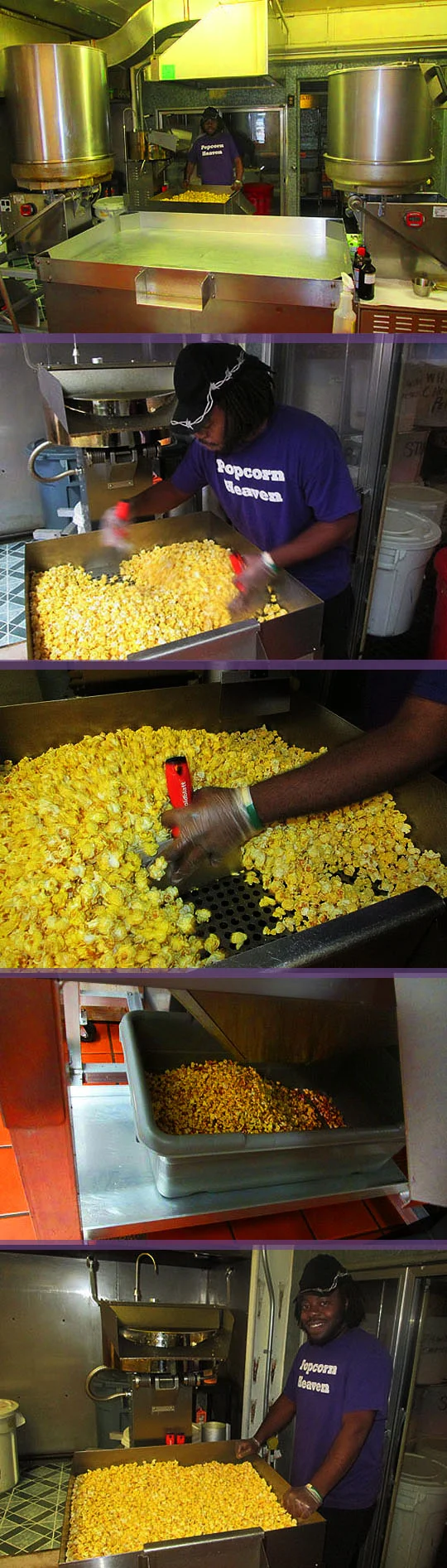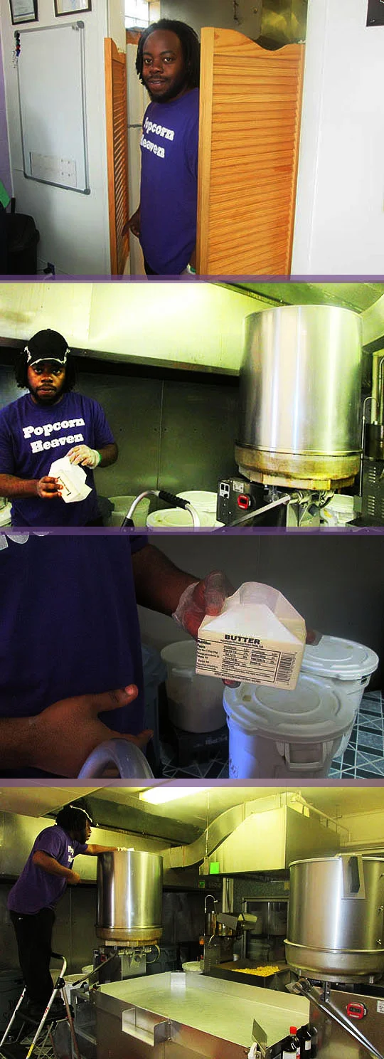 Terry was in the back and he offered to give me a behind the scenes look at Popcorn Heaven, so here we go! As you can see, there’s an impressive industrial kitchen back here where they make the popcorn fresh every day. And they use real farm-fresh ingredients like a big stick of butter and there’s Terry climbing up to add that and other ingredients to the mix.