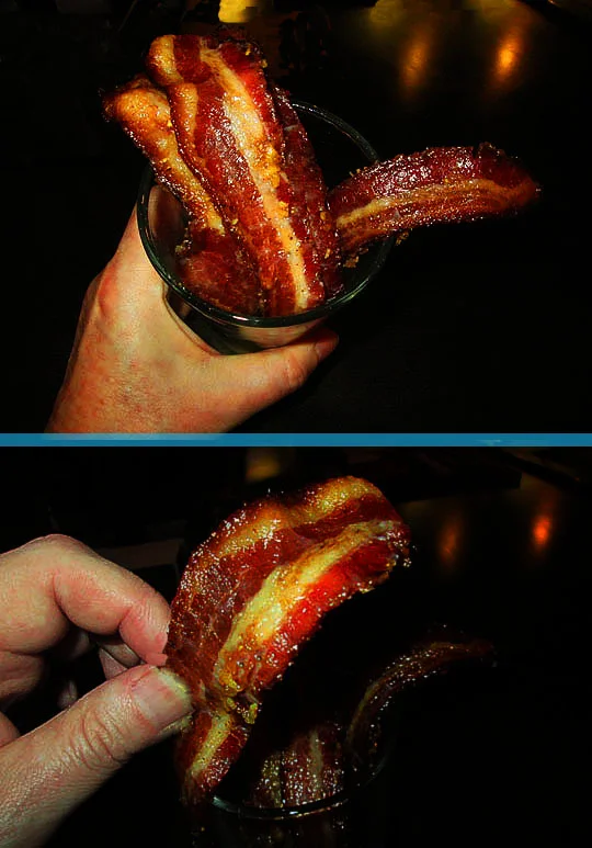 It’s a pint glass filled with giant strips of bacon and as good as it looks, it tastes even better! It’s kind of like a heart attack in a glass, but if you drop dead after you eat it, believe me, you’ll go with a smile on your face! You can read more about it in the review below, but this is some seriously tasty bacon!