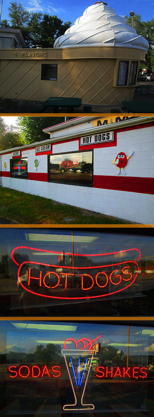 Here’s a view of the side of the ice cream cone structure and there’s an inside dining area behind it. Great neon in the windows!